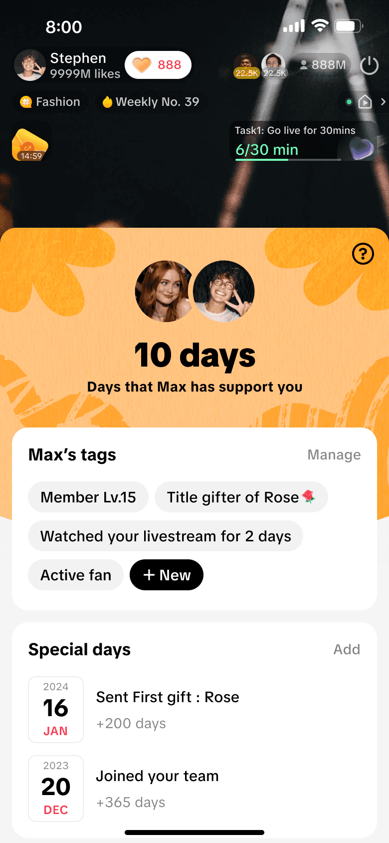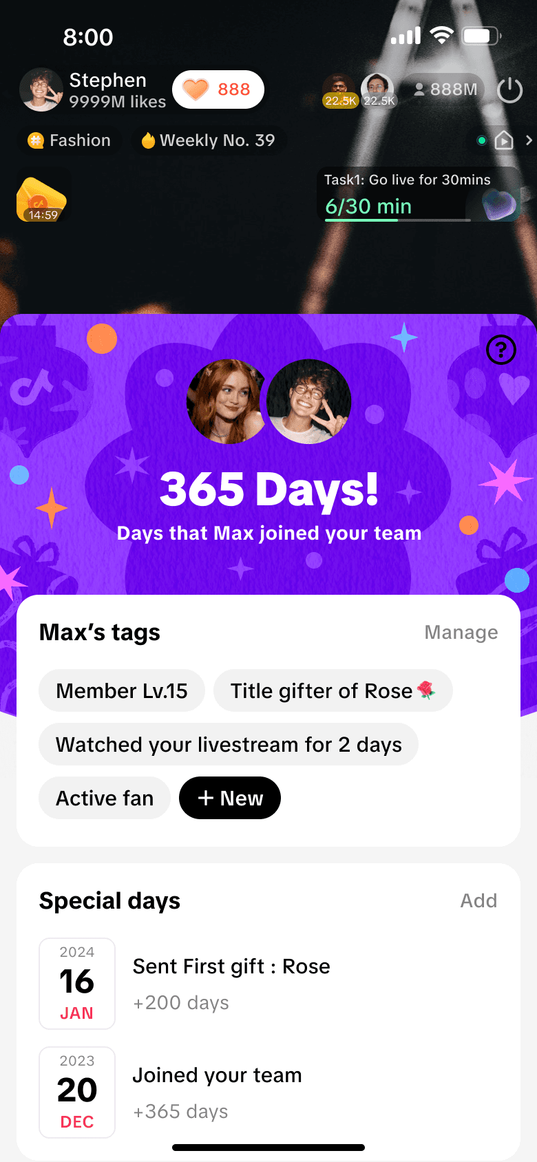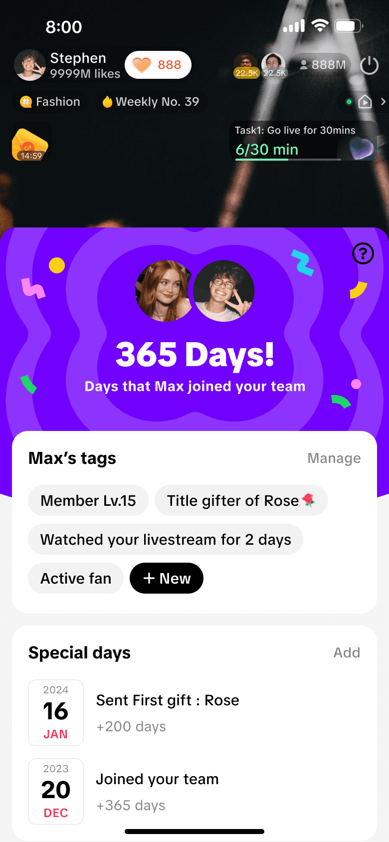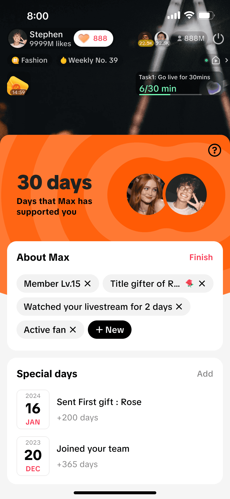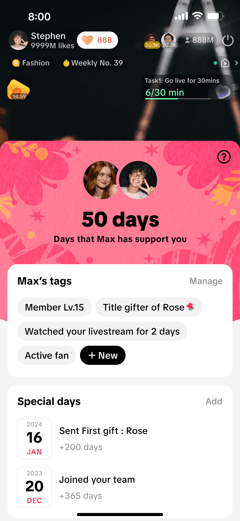 默认展示〈加团 / 首次送礼〉等重要时刻,加深情感连结