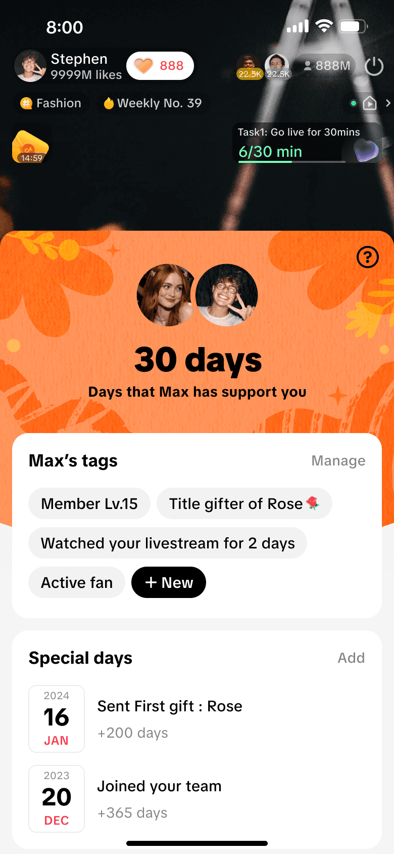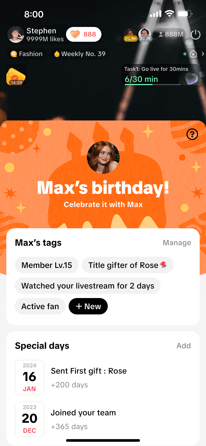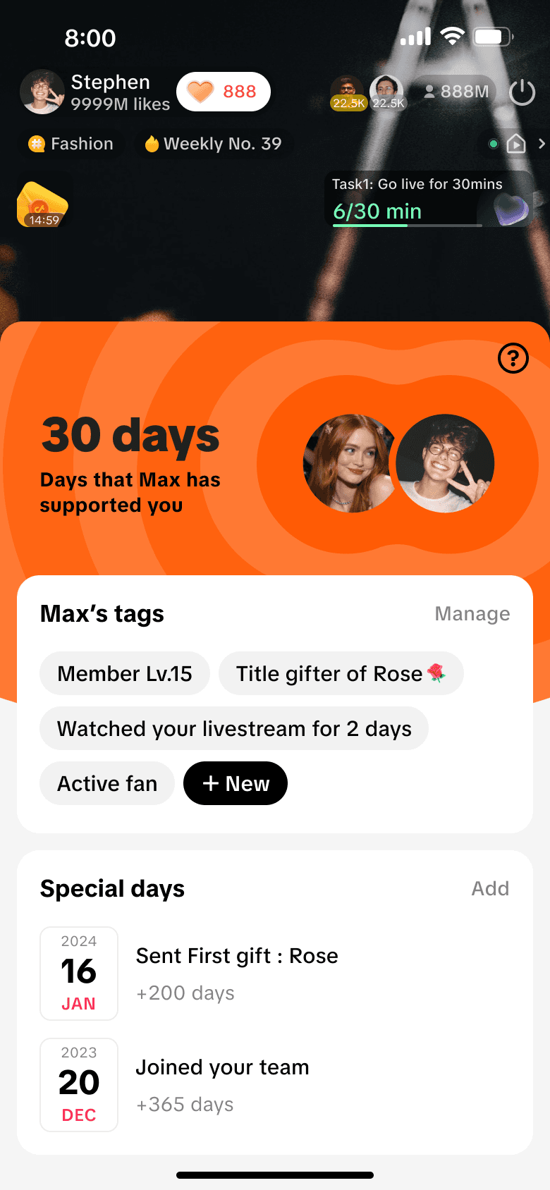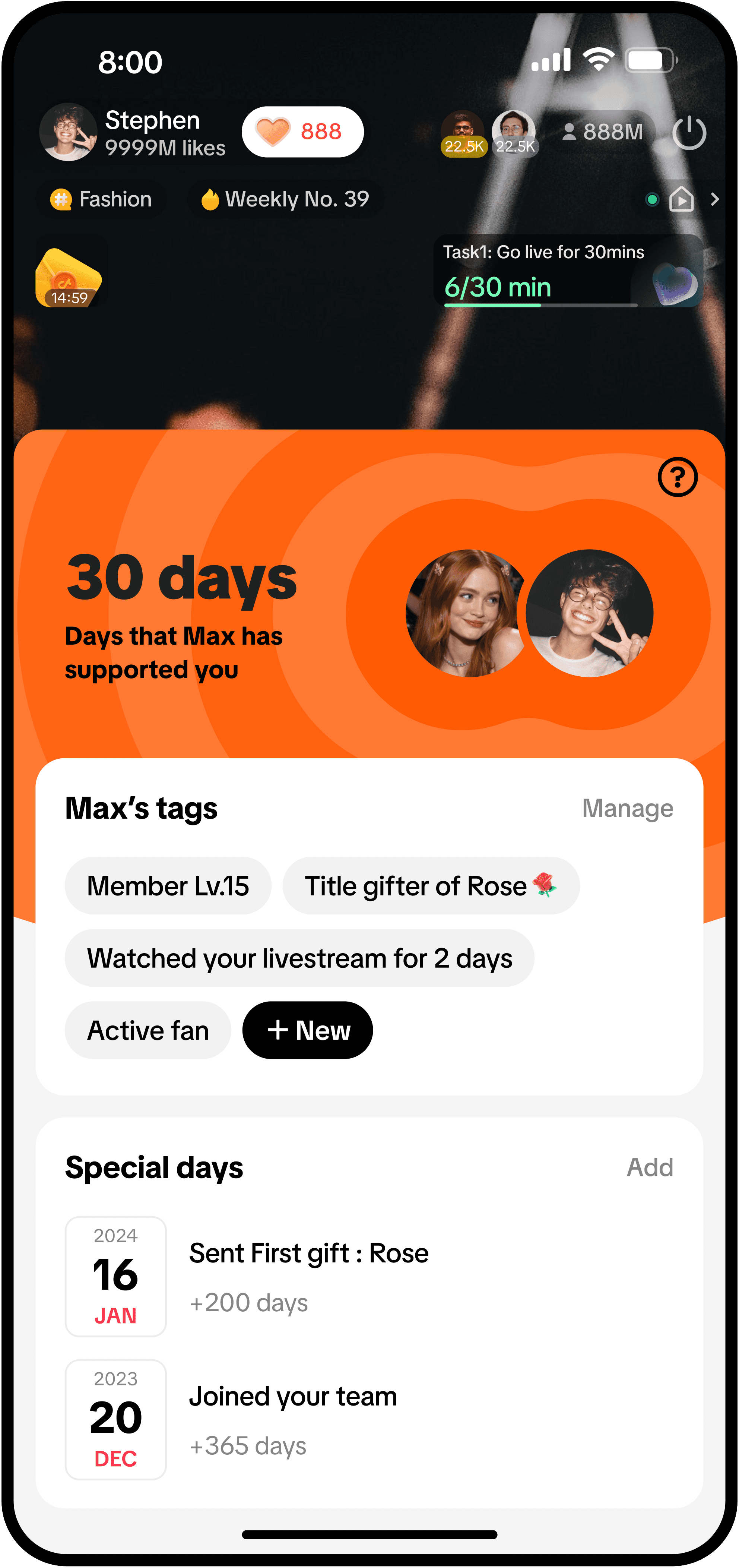 默认展示〈加团 / 首次送礼〉等重要时刻,加深情感连结