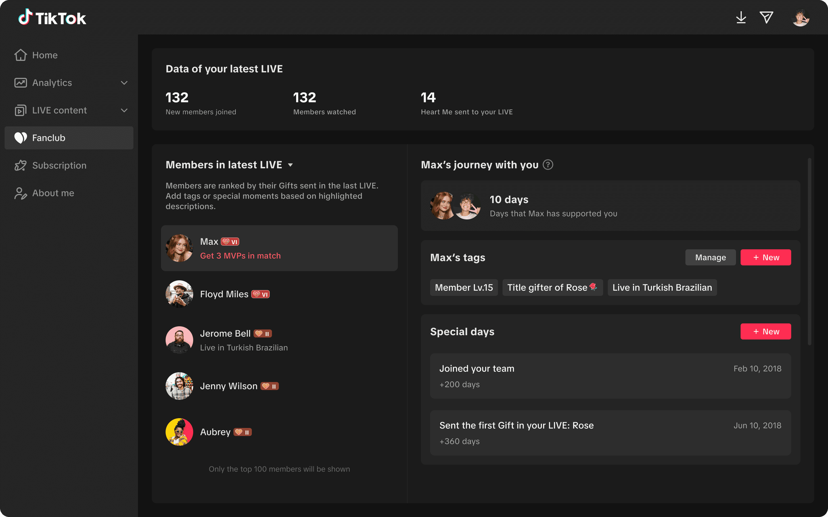 提供并沉淀主播和粉丝的关系信息,方便主播管理。